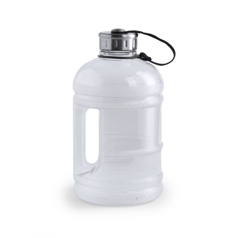 Bidón de PET de alta capacidad -1,89L-, con cuerpo en variada gama de vivos colores transparentes. Tapón de seguridad a rosca en acero inox, con cinta anti pérdida a juego y práctica asa de transporte.