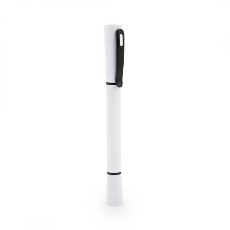 Bolígrafo con linterna led integrada. De capucha y en diseño minimalista de original combinación de colores negro y blanco. Linterna de activación giratoria y con pilas de botón incluidas. En tinta azul.