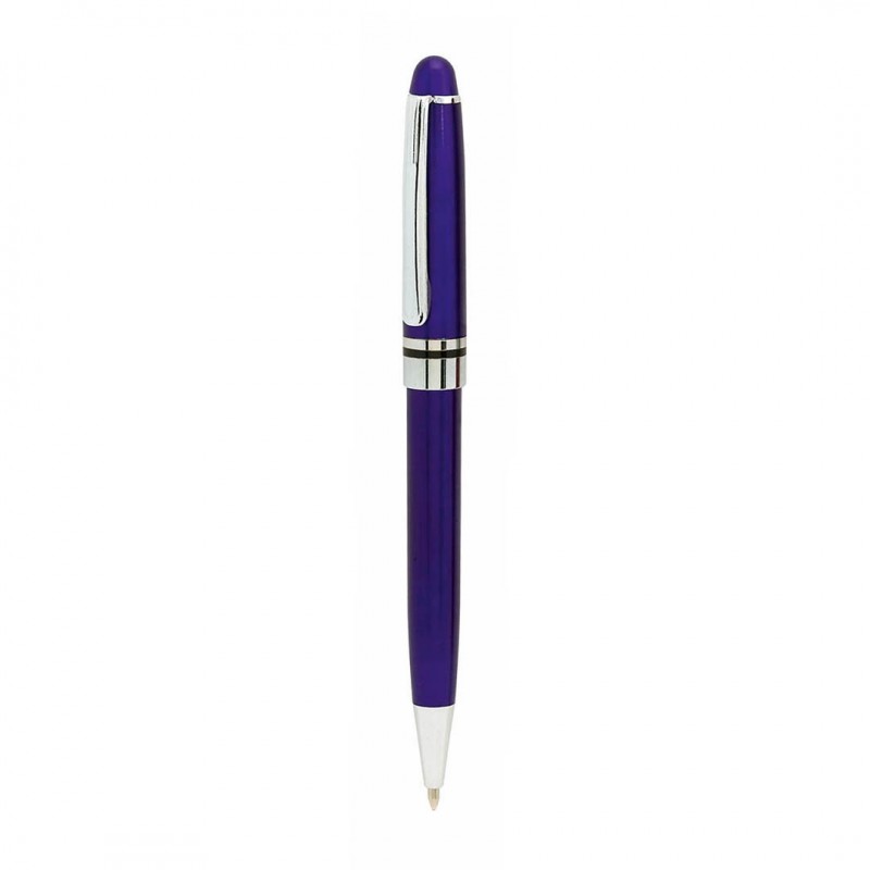 Bolígrafo de mecanismo pulsador de elegante diseño bicolor con accesorios en color plateado brillante y cuerpo de suave acabado en llamativos colores metalizados brillantes. Con clip metálico y anilla a juego. De cartucho jumbo y tinta azul.