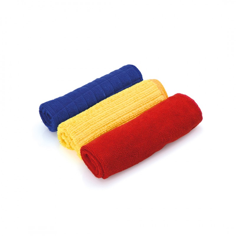 Set de 3 paños multiusos en suave microfibra antirayaduras con diferentes tramados. Medidas 30x30cm, refuerzos en laterales y presentado en estuche individual de cartón troquelado.