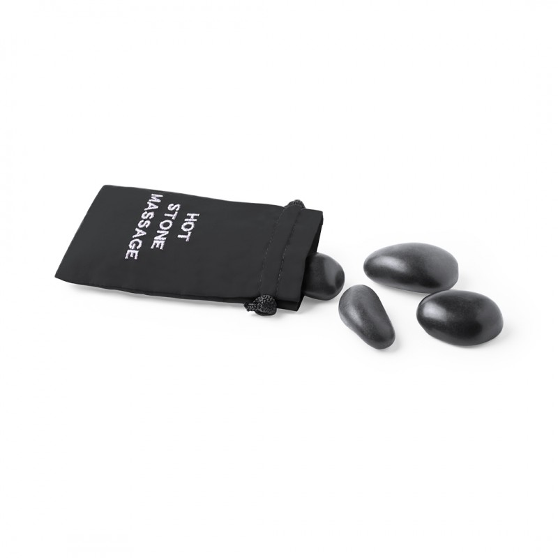 Set de 4 piedras para masaje termal presentadas en bolsa de tela de variados colores. Con hoja instrucciones de uso incluida.