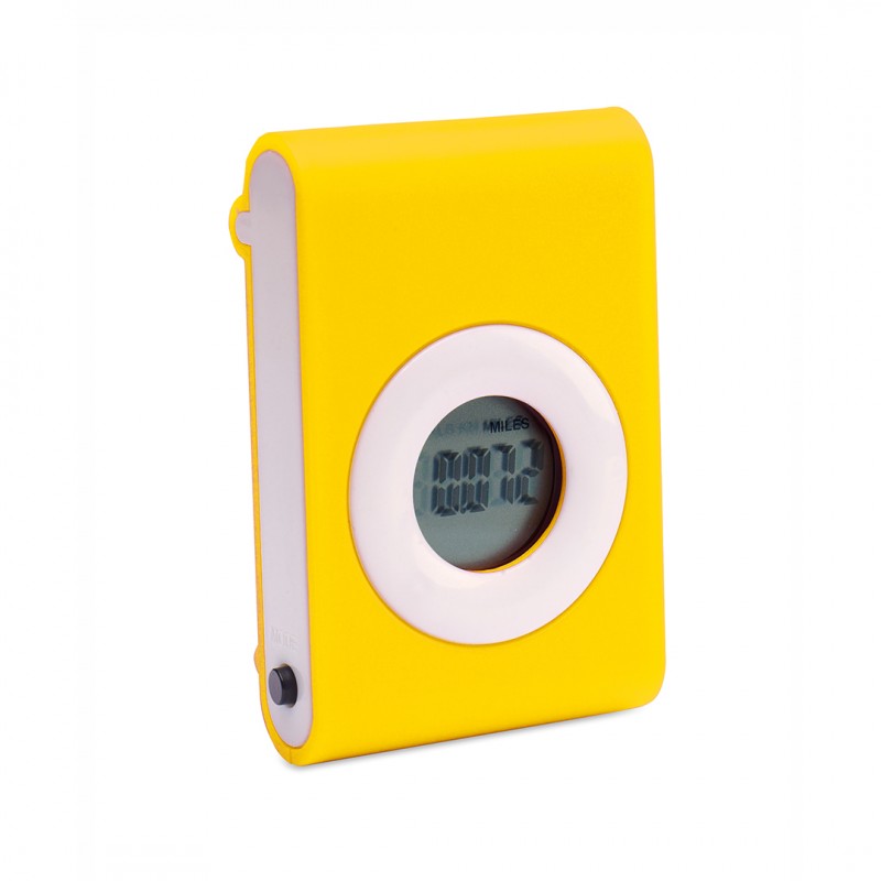 Práctico podómetro contador e pasos en original diseño bicolor con suave cuerpo en vivos tonos y pinza de fijación. Configurable con funciones: pasos, distancia recorrida y calorías consumidas. Pila de botón incluida con film protector y presentado en caja individual.