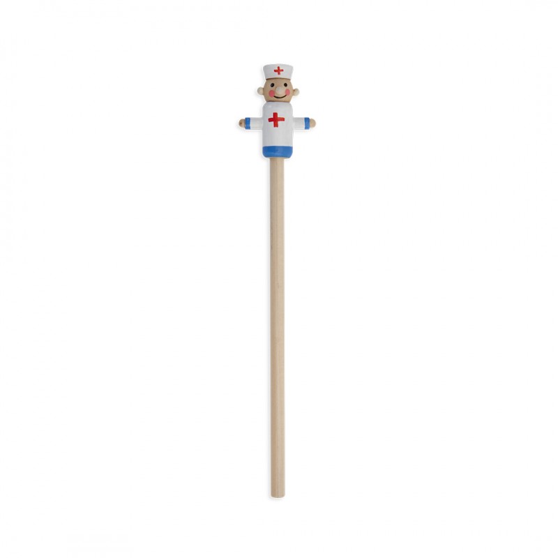 Lápiz de madera con cuerpo redondo en acabado natural y divertida figura de doctor en parte superior. Punta sin afilar.