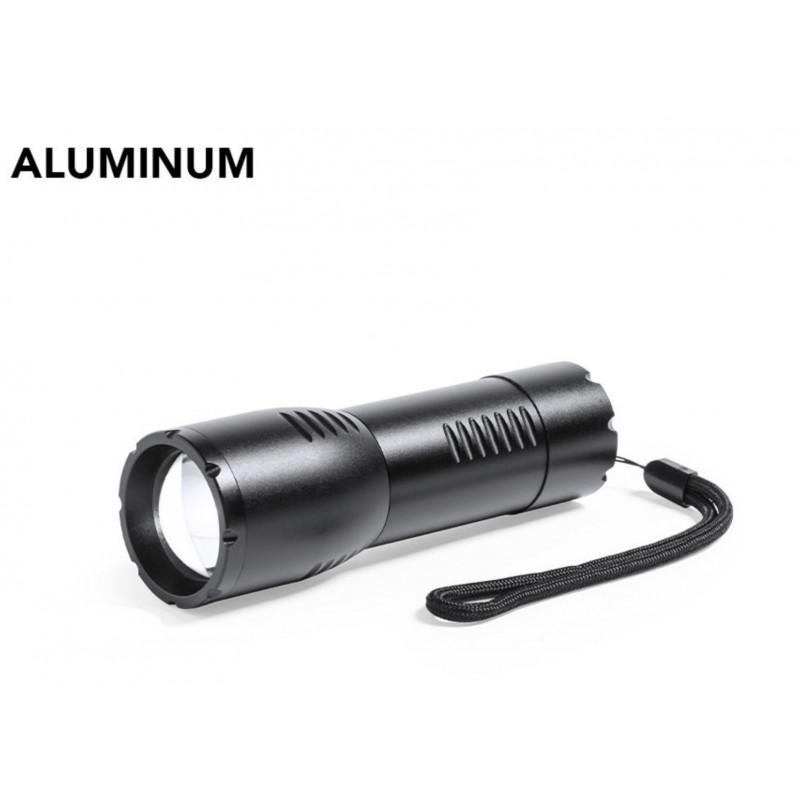 Linterna de alto poder de iluminación fabricada en aluminio de color negro y acabado mate. Con 200 lúmenes, función zoom y 3 posiciones de iluminación (fija e intermintente). Pulsador protegido con recubrimiento en resistente goma y cinta de transporte a juego. Presentada en caja individual negra de diseño. Alimentación a pilas (3xAAA no incluidas).