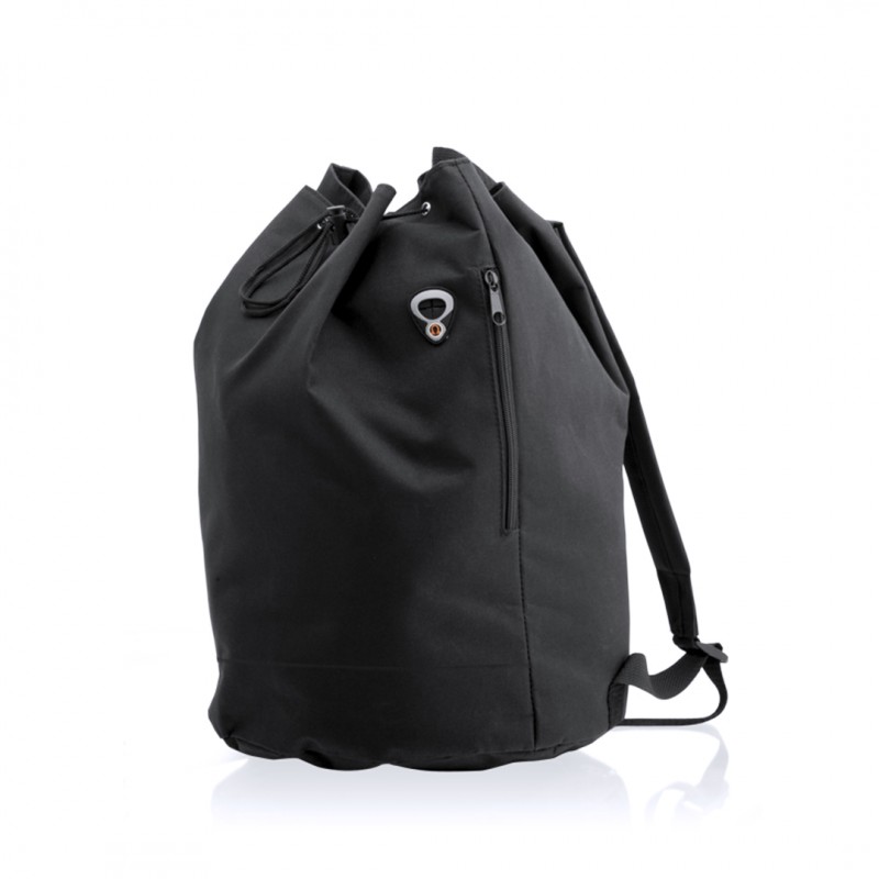 Mochila petate multiusos en resistente poliéster 600D de vivos colores. Cierre superior de cuerda con accesorio de ajuste y argollas metálicas reforzadas. Salida de auriculares y bolsillo exterior a juego, con cintas de hombros acolchadas y regulables.