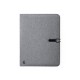 Elegante carpeta de línea nature tamaño A4. Fabricada en resistente 600D RPET efecto melange, elaborado a partir de plástico reciclado para así fomentar la reutilización de residuos plásticos y contribuir a la sostenibilidad del planeta. Detalles en negro y cierre metálico con cinta elástica especialmente diseñado para marcaje en láser. Interior con bloc extraíble de 20 hojas con disposición a una raya, 3 bolsillos de solapa, tarjeteros y soporte para bolígrafo. Distintivo RPET en esquina.
