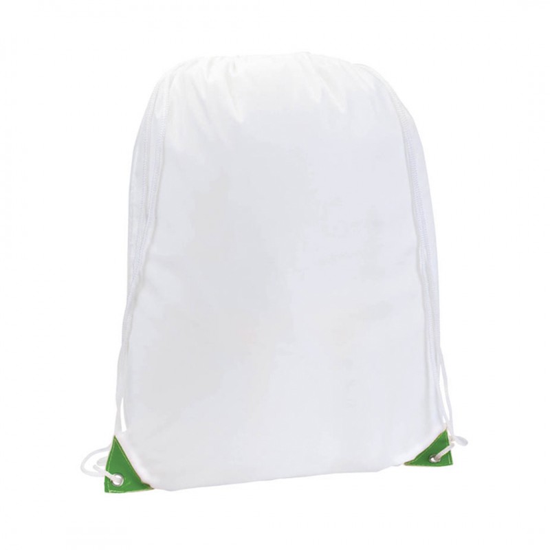 Mochila de cuerdas en suave poliéster 210T de color blanco con esquinas en alegres colores. Con cuerdas autocierre en color blanco y esquinas con argollas metálicas y refuerzo de polipiel. Especialmente diseñada para marcaje en sublimación.