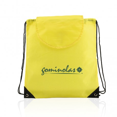 Mochila de cuerdas para niño en suave poliéster 190T de vivos colores. Con solapa de cierre de velcro, cuerdas autocierre en color negro y esquinas con argollas metálicas y refuerzo de polipiel.