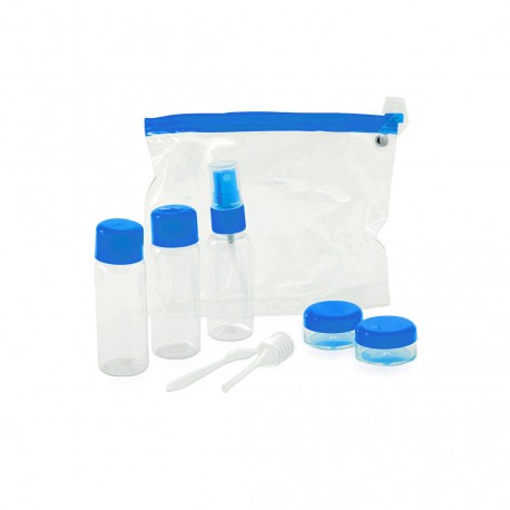 Set neceser de viaje de 7 accesorios en llamativos colores con accesorios a juego. Incluye dos botes para gel y champú con tapón a rosca, perfumador, dos tarritos para crema, embudo y paleta/aplicador. Presentado en estuche de PVC con cierre hermético a juego y práctica asa de transporte.
