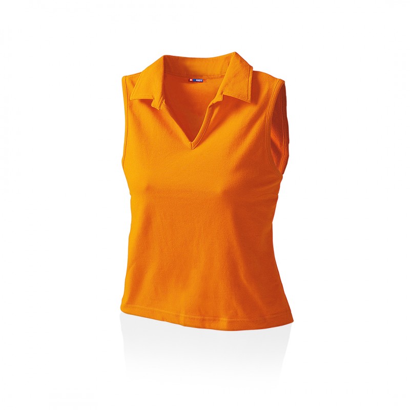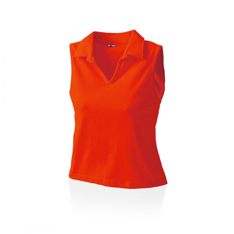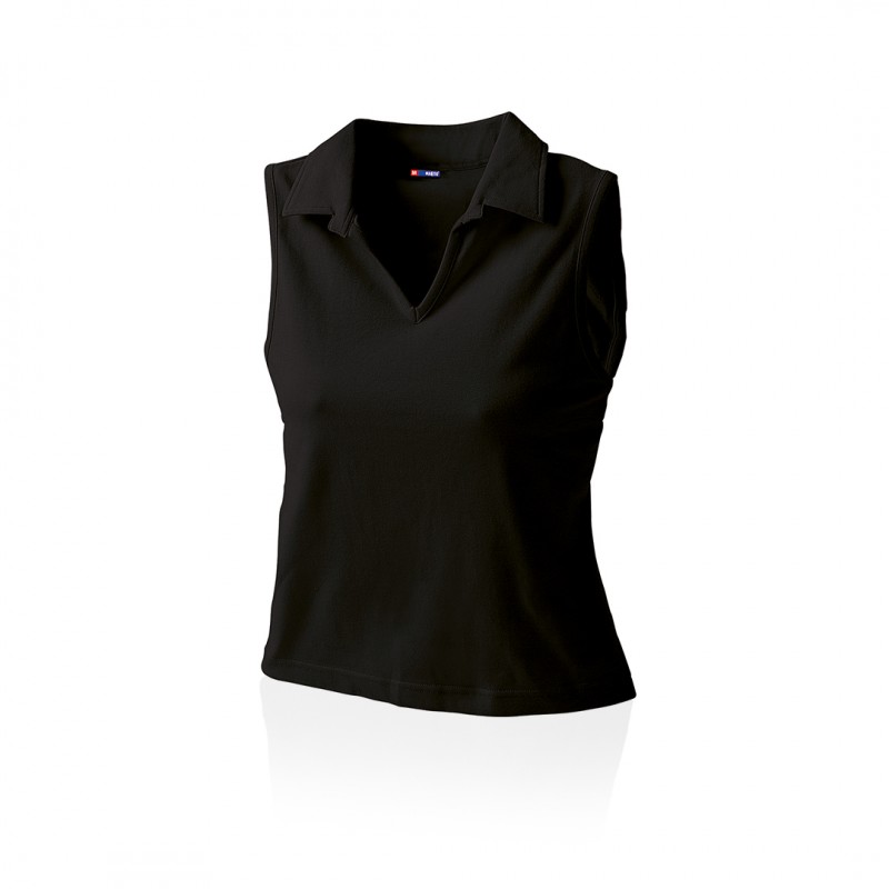 Polo sin mangas para chica en combinación de materiales algodón y lycra de 215g/m2. Disponible en variada gama de colores y en tallas M, L.