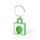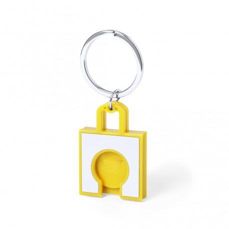 Original llavero moneda con forma de bolsa de la compra. En combinación de color blanco con vivos colores y con amplia superficie para marcaje.