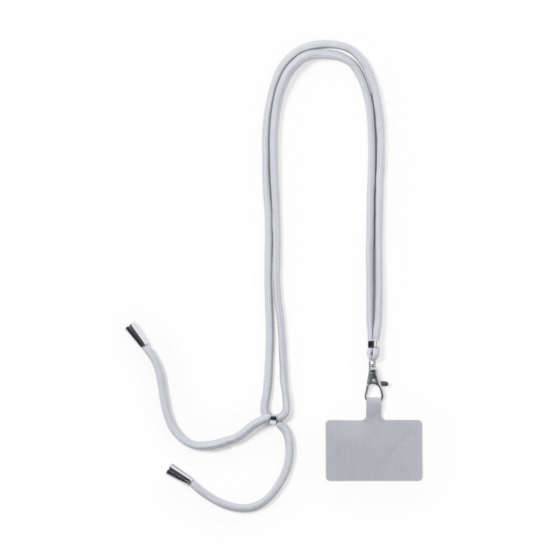 Original lanyard portamóvil en resistente poliéster. Con accesorio de transporte para situar entre la funda y el smartphone y mosquetón giratorio metálico. Ajustador en cuello y extremos de cordones en acabado cromado. Disponible en variada gama de colores.