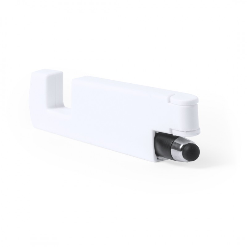 Original soporte plegable para dispositivo móvil en elegante acabado blanco y con minibolígrafo puntero integrado en base.