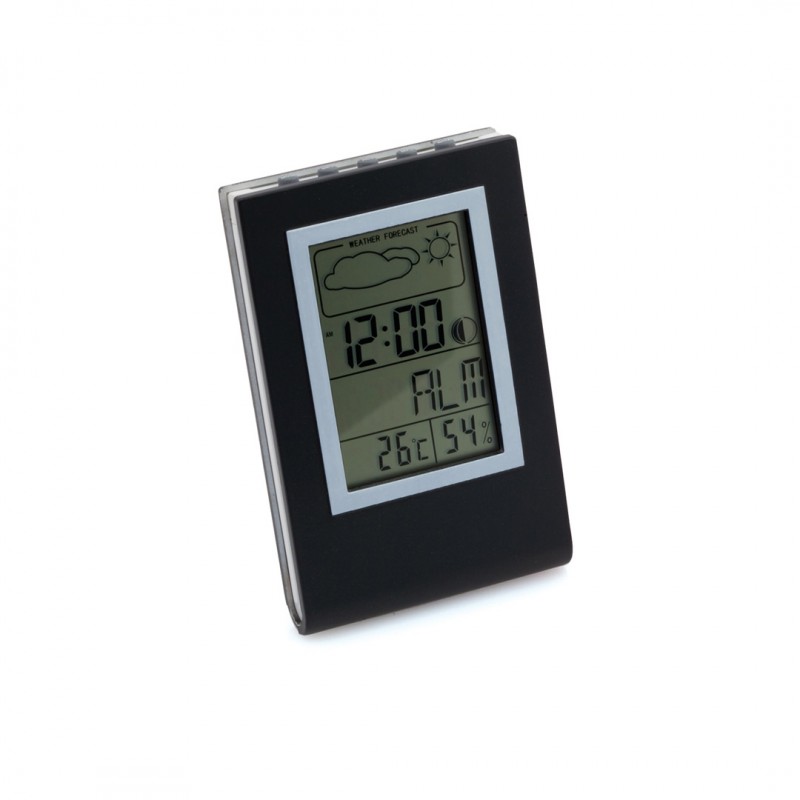 Estación meteorológica multifunción en atractivos colores y con soporte integrado. Pilas de botón incluidas con film protector y presentada en caja individual.