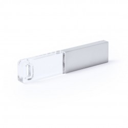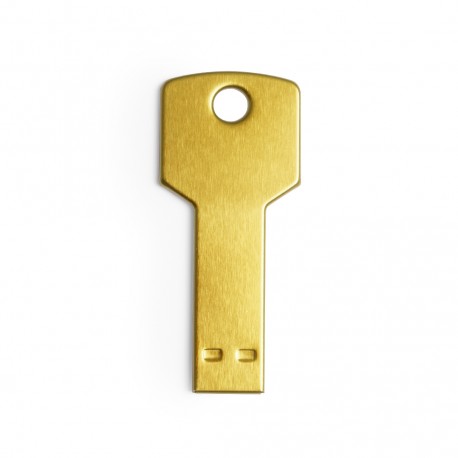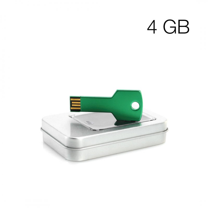 Memoria USB en forma de llave de 4GB de capacidad, de acabado en aluminio brillante y diseñada para llevar en el llavero. Presentada en estuche individual metálico con ventana y suave espuma troquelada.