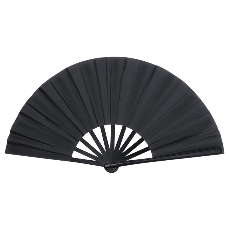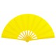 Abanico tamaño maxi con varillas de plástico y tela en poliéster de variados colores. Presentado en caja individual.