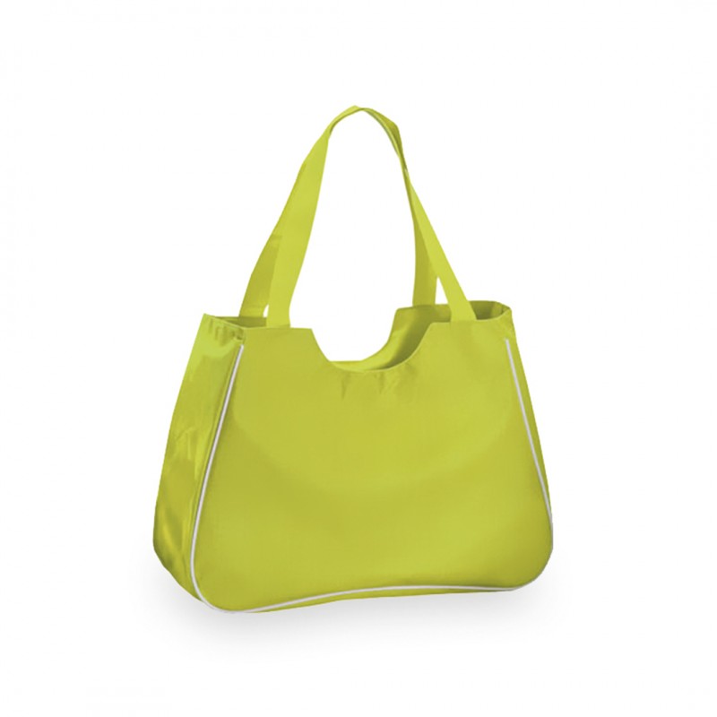 Original bolsa de playa en resistente poliéster 600D de vivos colores con neceser interior a juego. Con ribetes de refuerzo en color blanco, asas largas de nylon para hombro y cierre de cremallera.